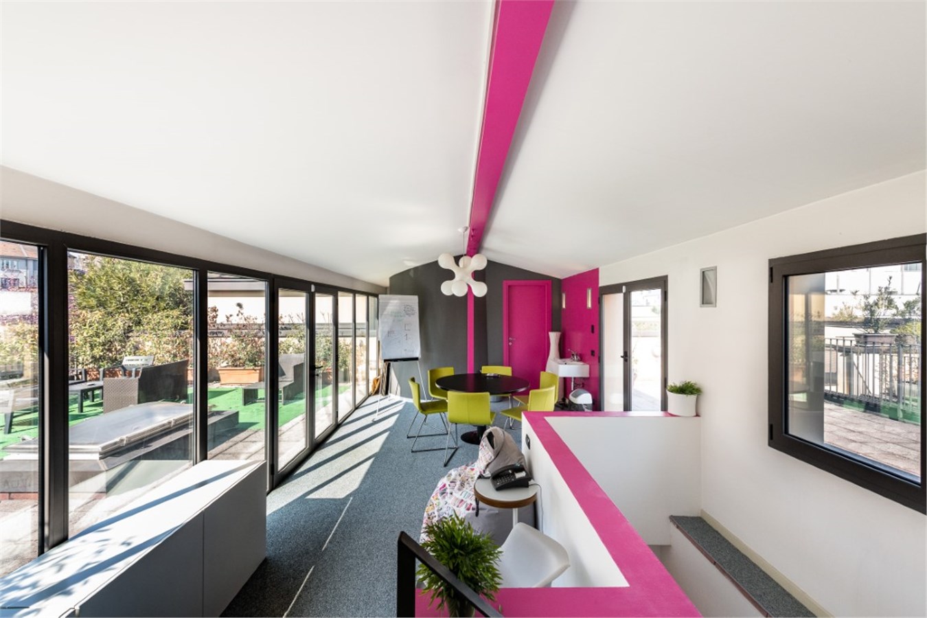 Tramite la scala si accede al soppalco di circa 48 mq, utilizzabile come studio, e più sopra si arriva ad un ulteriore open space di circa 40 mq dal quale si accede ai due bellissimi terrazzi, veri e propri giardini pensili.