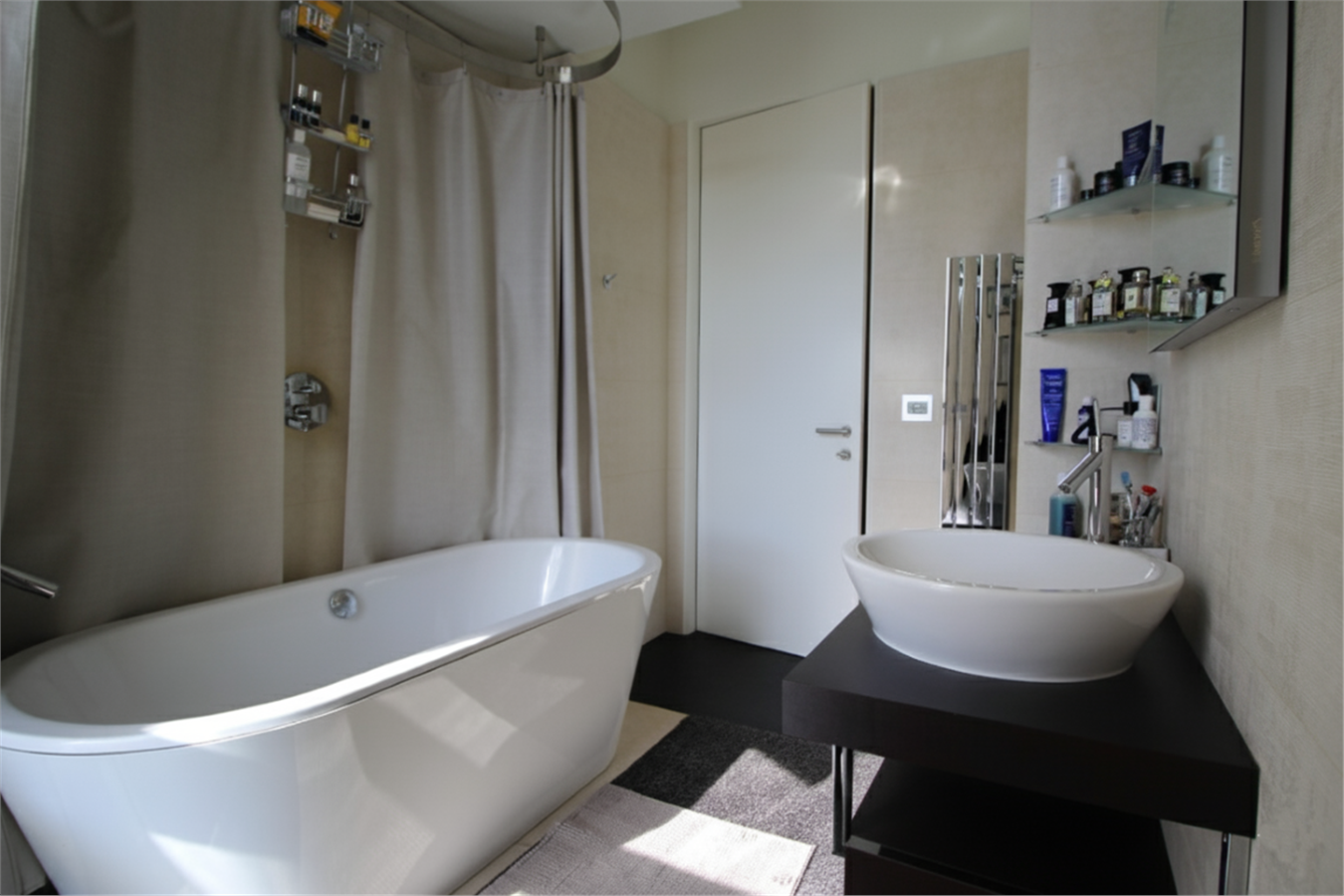 Attraverso un piccolo disimpegno che ne garantisce la privacy, si accede alla zona notte costituita da camera con cabina armadio e un bagno spazioso rivestito di pietra naturale con una bella vasca ovale e doccia sovrastante.