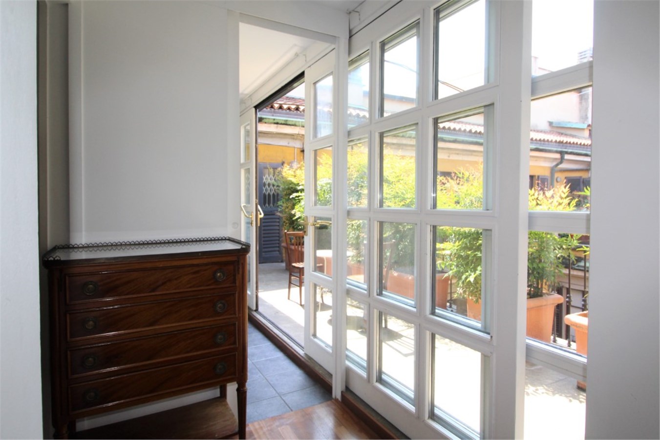 Questo appartamento di 120mq è sito al 4°e ultimo piano di un edificio d’epoca signorile, dotato di servizio di portineria. Il sapore di “old world charm” è evidente in alcune caratterizzazioni d’epoca appositamente mantenute nella ristrutturazione: soffitti a cassettoni, maniglie originali. Lo spazio abitativo si compone di un ampio soggiorno/pranzo che si apre su un piccolo angolo cottura con un meraviglioso terrazzo piantumato, prospicente il cortile interno. A completare la proprietà, 2 camere da letto doppie e 2 bagni.